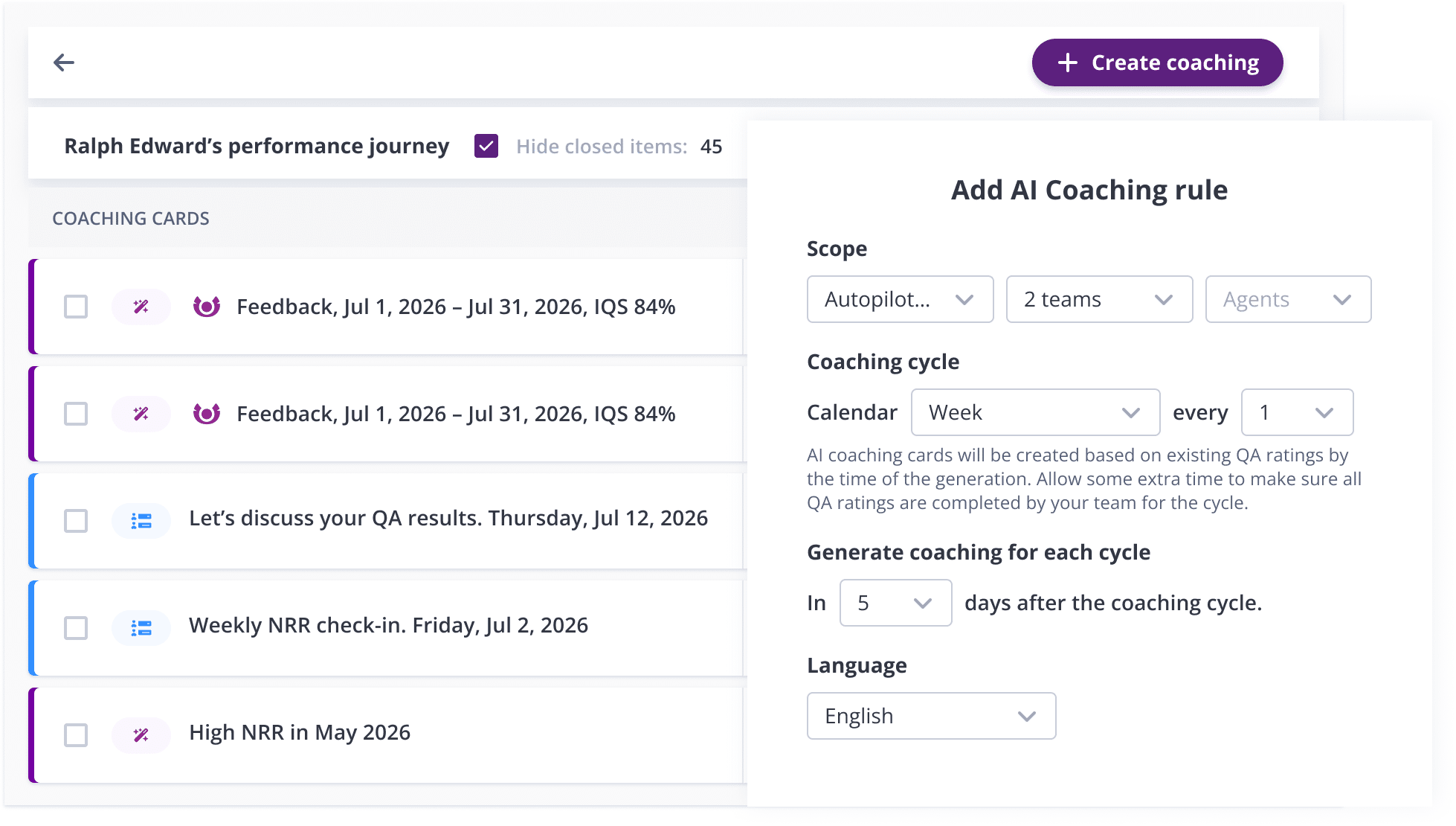 Centralize coaching history, QA scores, one-to-one meeting notes, and tasks in one place. Set goals based on an agent’s actual QA performance curve and trajectory, ensuring everyone has a realistic path to success. Support multilingual teams with coaching cards in all commonly used languages.
