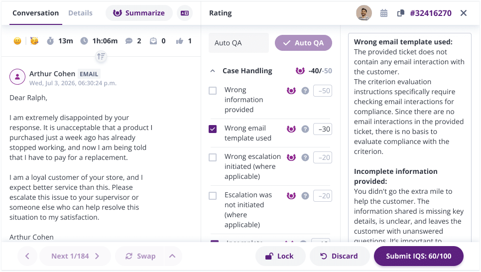 Automate the grunt work – grammar checks, spelling, procedural compliance – while you focus on nuanced evaluation. Auto QA pre-fills criteria and generates feedback comments for you to review, edit with your insights, and approve before sending to agents. You stay in control, but save time on the mechanical parts of ticket scoring.