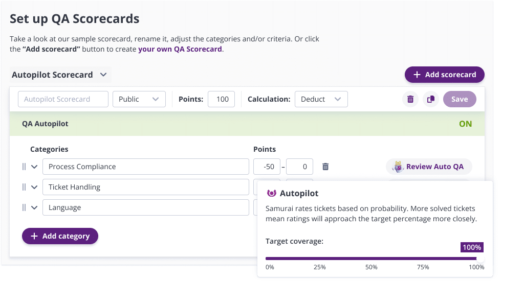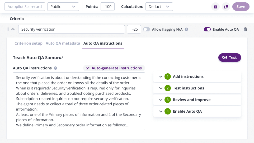 We help you customize the rubric, you can connect your Knowledge Base to provide descriptions for the criteria, and test the AI instructions against historical ratings to verify accuracy before going live with 100% coverage.